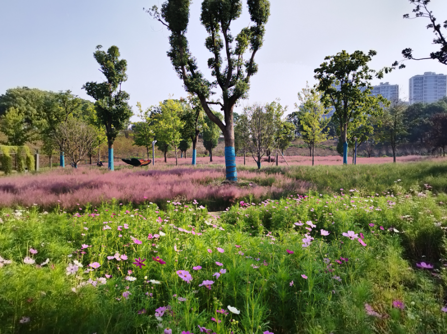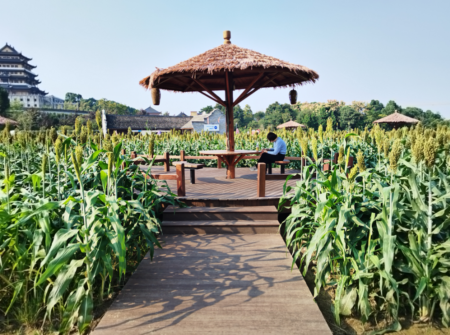 奉化仁湖農(nóng)趣園是集生態(tài)防護(hù)、景觀觀賞、農(nóng)田種植、休閑健身、文化娛樂(lè)等功能于一體的大型城市森林公園。公園整體設(shè)計(jì)按照“山為實(shí),水為虛”的古代山水理念,獨(dú)具匠心地體現(xiàn)奉化所特有的山水人文特色和彌勒佛教文化。一走進(jìn)園區(qū)大門(mén),成片的高粱地與水稻田交相輝映,整齊劃一,一個(gè)個(gè)高粱穗,似一只只火把,伸向藍(lán)天,訴說(shuō)著豐收的喜悅。木質(zhì)連廊將高粱地分割得錯(cuò)落有致,大家登上連廊,在周?chē)吡淮負(fù)硐?,紛紛拿出手機(jī)與高粱來(lái)個(gè)親密接觸,記錄著美麗瞬間。在園區(qū)內(nèi)還有農(nóng)作物科普小知識(shí),大家駐足閱覽,仿佛身在城里的我們走進(jìn)了鄉(xiāng)間田野。